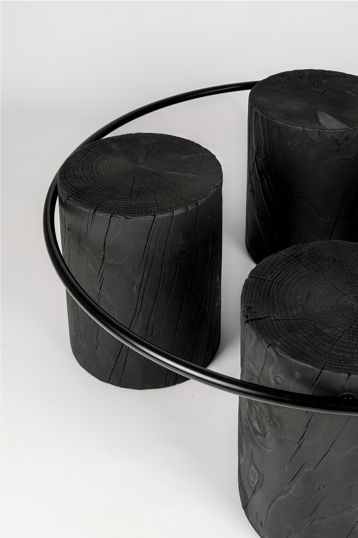 Studio F focuses its work on the importance of solid wood and its recovery. The selected wood is a centennial Cedar charred with the Japanese technique of Shou Sugi Ban.